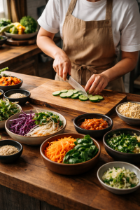 Passionnée de cuisine et de produits frais, j’ai choisi de proposer un concept centré autour d’un plat emblématique : le bibimbap (bap / gukssu), décliné en plusieurs saveurs.